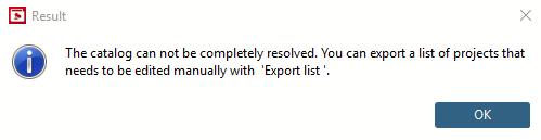 Si le catalogue n'a pas pu être entièrement résolu, il faut procéder à des adaptations pour les projets sous la catégorie(4) Création manuelle de la recherche inversée nécessaire [Manual creation of the reverse search necessary]: