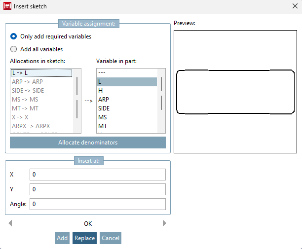 Vous pouvez effectuer une comparaison entre les variables dans l'esquisse à importer et l'esquisse PARTdesigner actuellement ouverte . Dans le champ Affectation de l'esquisse [Allocations in sketch], vous voyez les variables de l'esquisse d'importation, dans le champ Variable de la pièce [Variable in part], celles de l'esquisse PARTdesigner actuelle.
