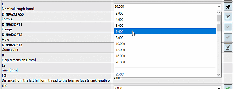 Pour toutes les autres variables, le composant peut être spécifié par le biais d'une sélection de zone de liste.