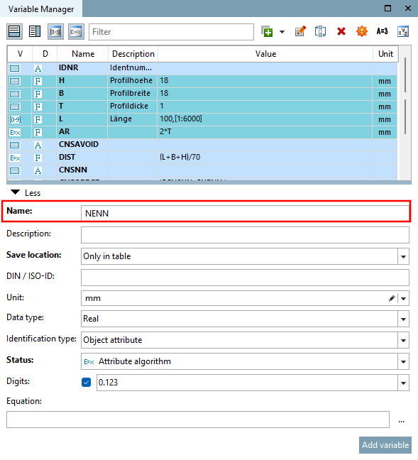 -> La variable NENN est ajoutée à la liste de toutes les variables de projet.