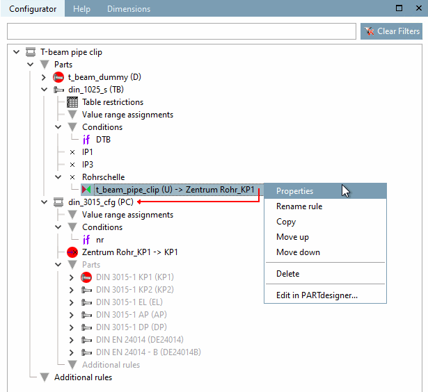 Pour ce faire, cliquez sur la commande Propriétés [Properties] dans le menu contextuel de la règle "Collier de serrage" de la fenêtre Configurateur [Configurator] d'arrimage.