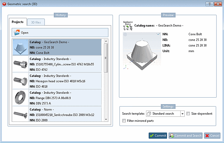 La recherche géométrique (3D) [Geometric search (3D)] convient à la recherche indépendante du texte, également comme complément à la recherche plein texte, en particulier pour la recherche dans le pool de pièces propres, pour les pièces non classifiées ou les pièces qui ne sont pas saisies dans ERP/PDM. Grâce à sa précision, vous pouvez trouver la proverbiale aiguille dans une botte de foin.