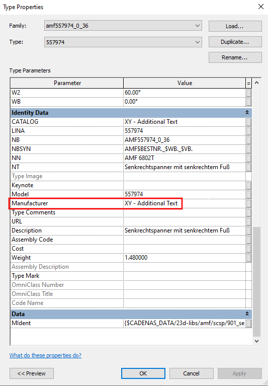 L'illustration suivante montre, à titre d'exemple, l'attribut "Manufacturer" après l'exportation dans les Revit Type Properties.