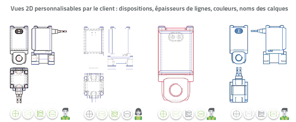 configurable individuellement en fonction des besoins spécifiques du client: épaisseurs de lignes, couleurs, vues etc. Cette configuration personnalisée des dérivés 2D est automatiquement sauvegardée et récupérée pour les téléchargements futurs.