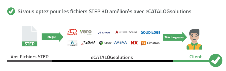 Ces fichiers STEP améliorés répondent aux exigences des ingénieurs et des concepteurs. Vos clients et prospects sont satisfaits, et vous atteignez une couverture maximale du marché avec de nombreux formats CAO pour le même produit.