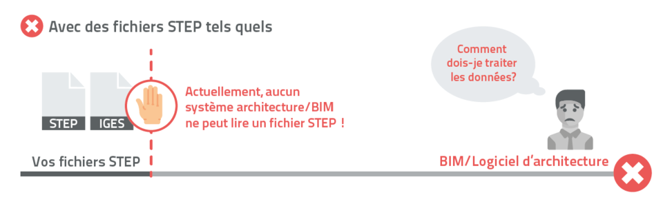 Les fichiers STEP ne sont supportés par pratiquement aucun logiciel de BIM ou d’architecture, contrairement aux formats basés sur MESH tels que IFC ou 3D Studio Max qui sont devenus de plus en plus populaires dans ce domaine. Les formats mécaniques tels que IGES, STEP PARASOLID ne jouent donc aucun rôle dans l‘architecture. Avec les fichiers STEP, vos produits trouveront donc difficilement leur place dans les projets de construction des architectes et des urbanistes.