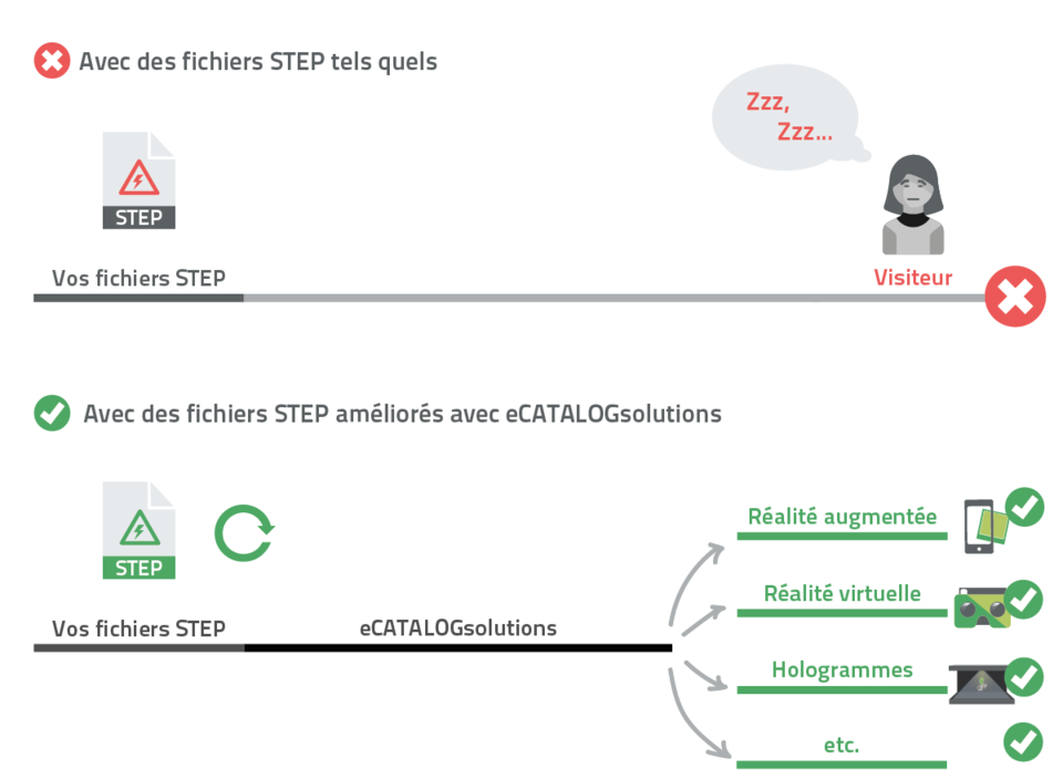 Que ce soit à l’aide de la réalité augmentée, de la réalité virtuelle ou des hologrammes, avec vos modèles 3D STEP et la technologie eCATALOGsolutions de CADENAS, vous êtes prêt à rendre vos produits mémorables.