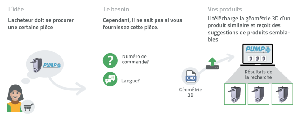 Les ingénieurs, architectes et acheteurs ne veulent généralement pas se préoccuper des désignations des produits spécifiques à chaque fabricant. Avec la recherche géométrique vos clients peuvent simplement télécharger un composant en 3D similaire à celui qu’ils recherchent. Le système scanne votre catalogue numérique pour trouver les pièces dont la géométrie est semblable.