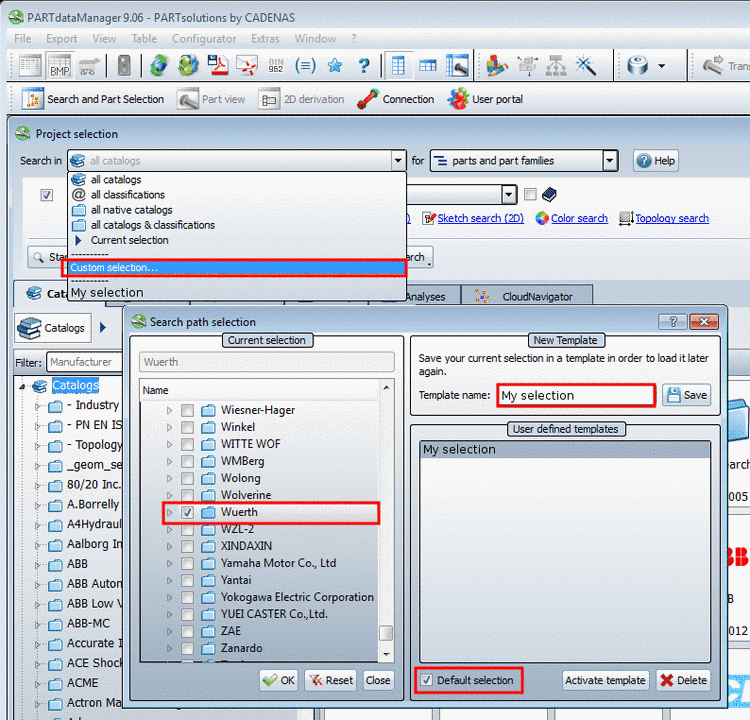 If the option Default selection is selected, then at PARTdataManager start for the Keyword search always this is loaded by default.