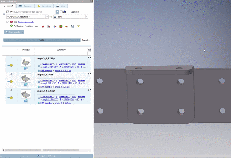 The Partial search is a geometrical search. However, not parts are used as reference, but individual features such as plane, cylinder, etc. And then parts containing these features are found. The geometrical arrangement of features is also taken into account.