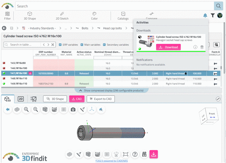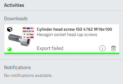 -> The dialog box Activities is opened and the generated part is available for download.