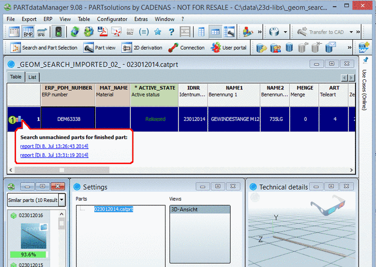 At parts, which are found via Geometric search (3D) and are transferred into the Part comparison, there, in the Tabular Compare section the geometric similarity is overtaken and displayed as well.[74]