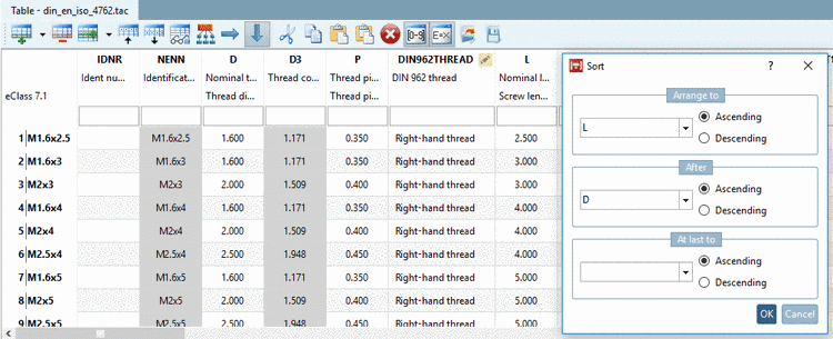 Using the function Sort, you can determine the sorting of Tabular values, as it can be seen in end media such as PARTdataManager later. (The sorting remains permanently until another sorting is determined.)