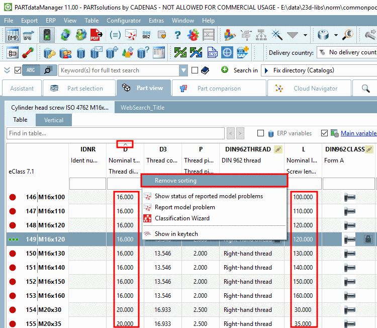 In PARTdataManager, using the arrow keys above each table column the sorting can be individually determined. Remove sorting restores the default sorting as it has been determined in PARTdesigner.
