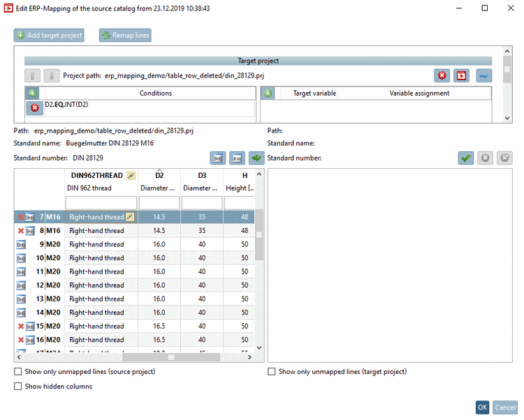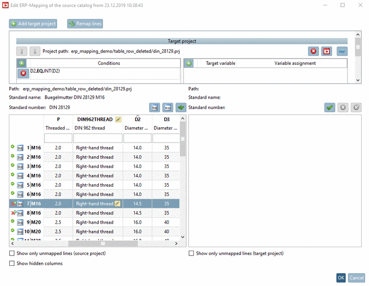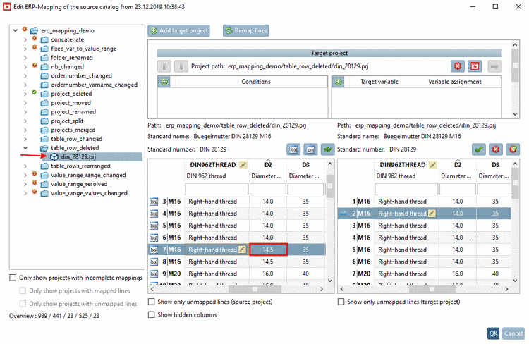 Select rows with assigned target project -> The table of target project is displayed on the right. The correct row is marked