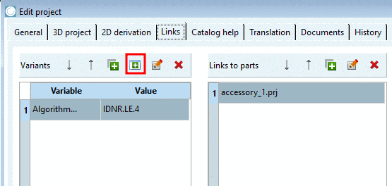 In dialog area Variants, you can optionally determine, if the accessory part shall be displayed for the whole project or only for certain rows.