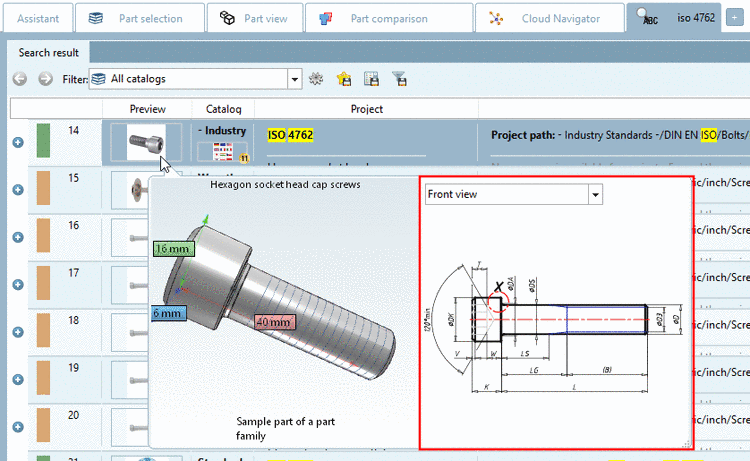 You can display catalog and project data directly in the part selection on directory and project level at the bottom right.
