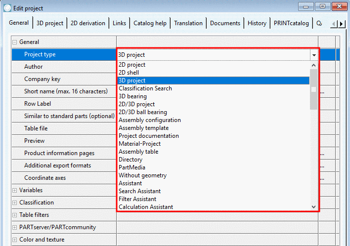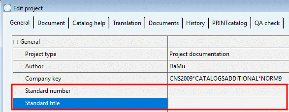 In the case of projects without table (such as document projects) fields Standard number (e.g. DIN 404) and Standard title (e.g. “Slotted capstan headed screw”) are also available.