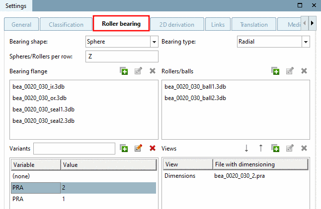 The individual components of a bearing, i.e. the *.3db files of the Bearing flange and Rollers/balls, are summarized in a rolling-contact bearing project file.