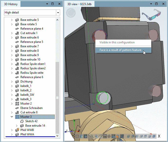 When selecting an element, except the one containing the Pattern origin, the note Face is a result of pattern feature is displayed.