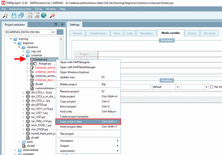 Via context menu command Copy project data, you can simply copy project data and insert it in other projects and directories (e.g. also catalog root directory).