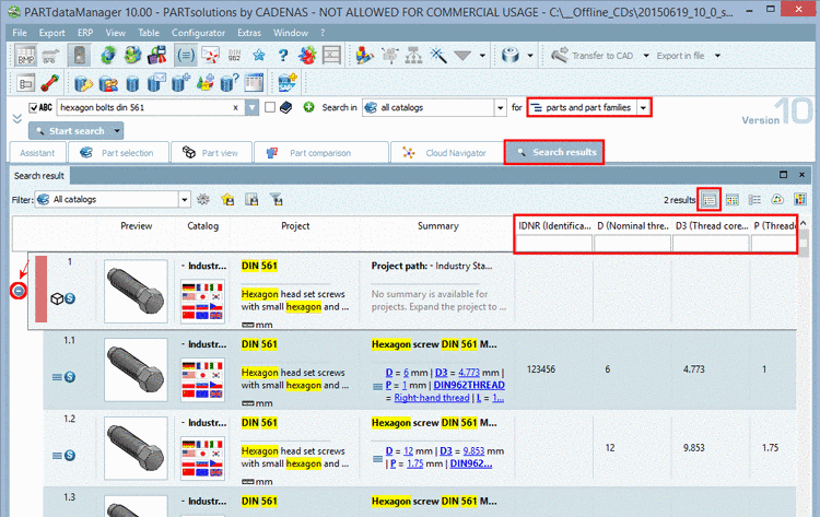 In the following example a search for "head cap bolt" and the numerical value "50" has been performed. Search terms are marked with yellow color.