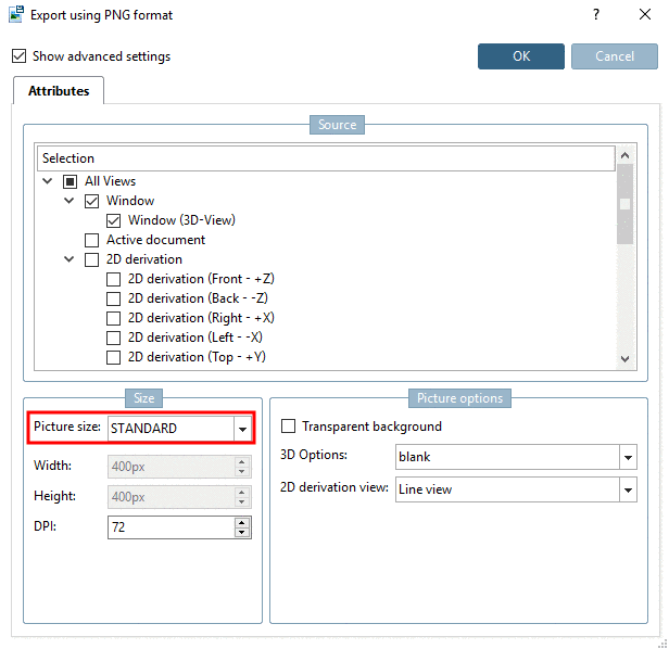 Solution: Set target file to CADENAS standard 400x400, color depth 8 bit. When using automated generation this is ensured, if under Picture size, the option STANDARD is selected.
