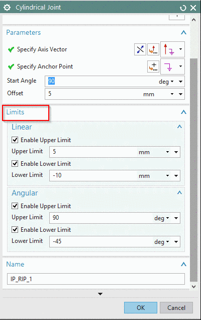 For hinge and cylindrical joints, you can specify joint limits that define an acceptable range of motion for the joint.