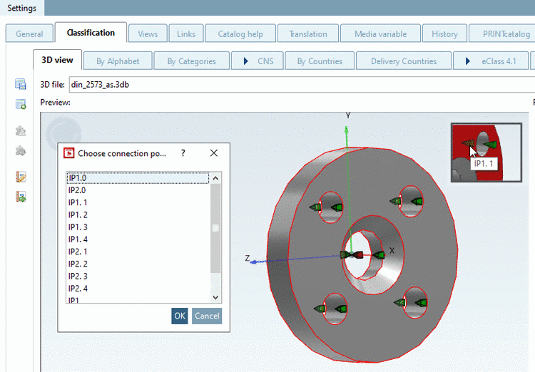 As classifying of connection points by Published elements plays an important role, this field has its central place on the tabbed page 3D view. In the Preview, connection points are displayed and can directly be selected.