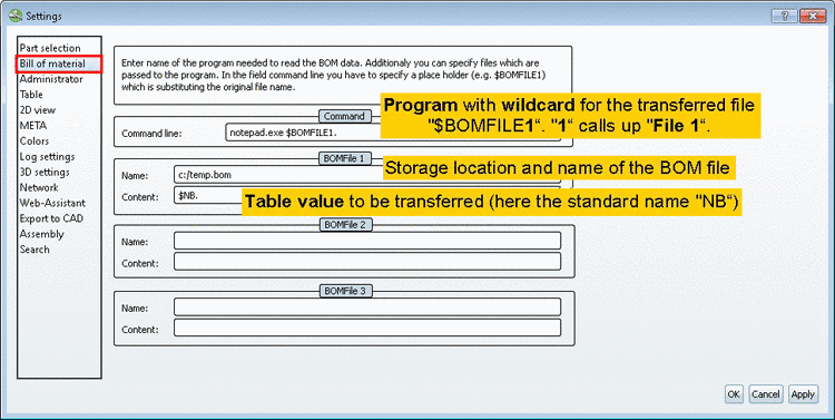Command line: this is where you define the program ("notepad.exe" in the example) to be launched as the "platform" for your Bill of Material. The placeholder "$BOMFILE 1 addresses BOMFile 1 and "$BOMFILE 2 addresses BOMFile 2 etc.