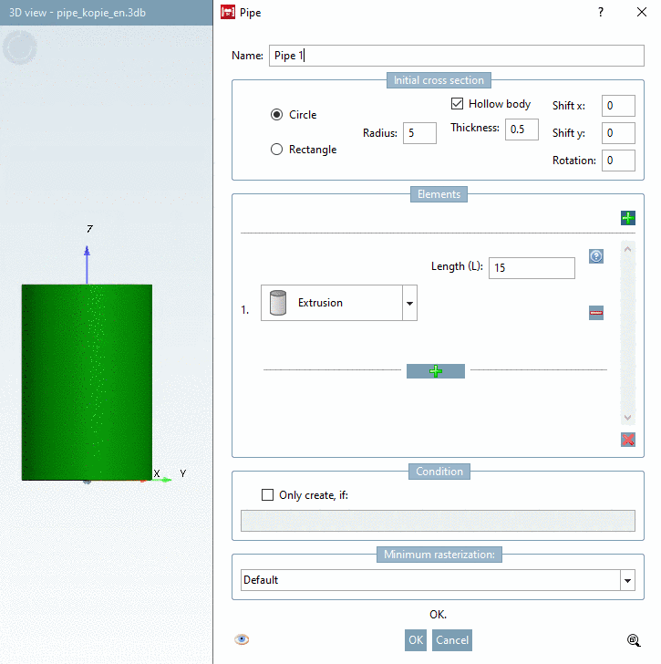 Thickness (T): Only active if the whole pipe is hollow (see Fig. „ Initial cross section -> Circle “), if so a value needs to be given.