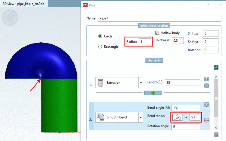 Bend angle: Enter an angle to describe how far the pipe should bend in this element (segment of a circular arc). Any values between 0° and 360° are valid.