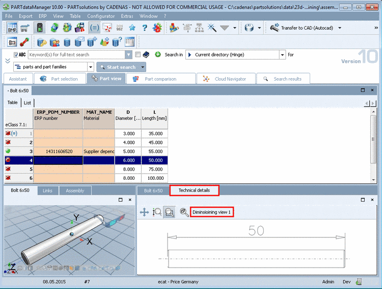 Later in PARTdataManager, the dimensioning view can be selected and displayed in the Technical details dialog area.