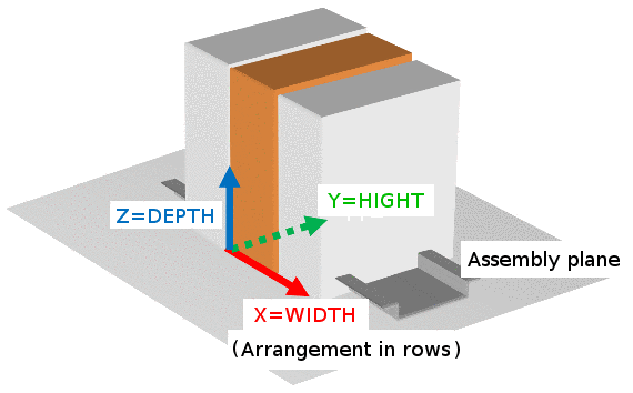 The standard assembly plane is placed on the X/Y plane, whereby the X direction is the direction of arrangement in rows.