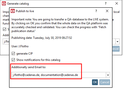If you stated one or a number of e-mail addresses in the dialog box Generate catalog or Publish Live state... (see Section 6.10.5, “ Generate QA catalog... | Publish Live state... ”), you will receive a notification email with attached log file after finished generation or publication. Should there have been any errors, you are informed here in detail.