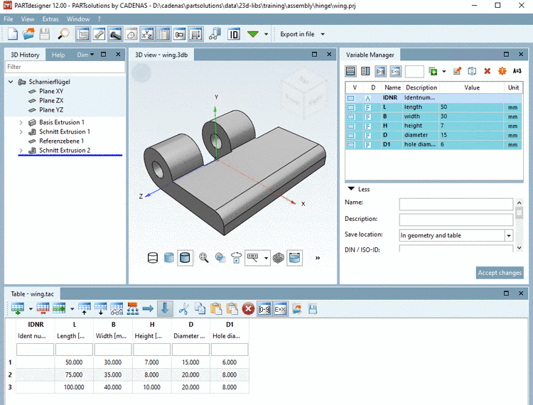 -> PARTdesigner is opened with the docking windows 3D History, 3D view, Variable Manager and Table.