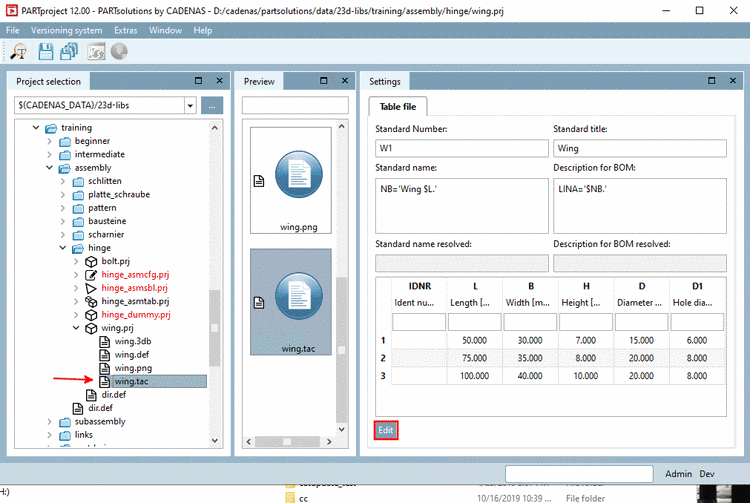 PARTdesigner is called in PARTproject after selecting the desired file under Project selection and then either via context menu command or in the docking window Settings by clicking on the Edit button.[76]