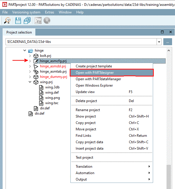 • *_asmcfg.prj file: Project selection -> context menu command Open with PARTdesigner