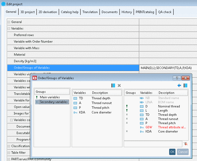 Core diameter Outer thread: Automatic calculation and display in PARTdataManager