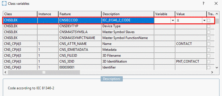 Under Class CNSELEK -> Attribute CNSIECCOD with Description IEC_81346_2_CODE, set respective