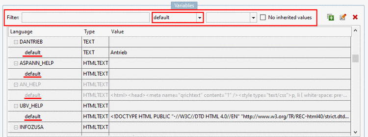 No inherited values: When activating, variables which do not have own values in relation to the selection under Project selection, meaning only inherited, are displayed grayed out.
