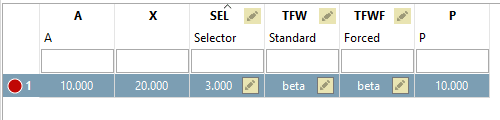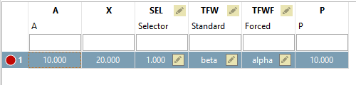 When loading the table, starting values (default values) are displayed. The start value is represented by the first parameter set under Equation. In the case of selector, here in this example, this is 1, for TFW (TMA) and TFWF (TMAF) according to the set condition this is "alpha".