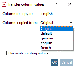 In the same-named dialog box you select the source language (Column, copied from), and the target language (Column to copy to [default is the language of the selected column]).