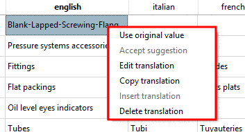 The expressions in light grey lettering are existing translations which are already used in other directories and which PARTproject has "noted". They are simply suggestions and may either be overwritten or entered permanently with context menu command Accept suggestion (for a single field) or Use suggestions (for a whole column).
