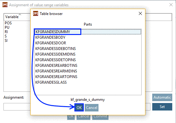-> The dialog box Table browser is opened. It contains a listing of all assembly parts.