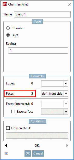 In the dialog box Chamfer/Fillet, under Faces, the total number of selected faces is shown. (At last step of repetition '5' in this example.)