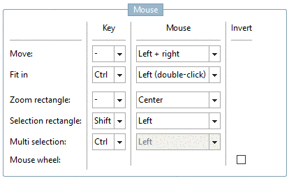 Mouse wheel: With the Mouse wheel, you can zoom in and out. Turning downwards will reduce the image. If Invert is active exactly the other way round. Depending on where positioning the mouse cursor before scrolling the mouse wheel, the object's position is adjusted.