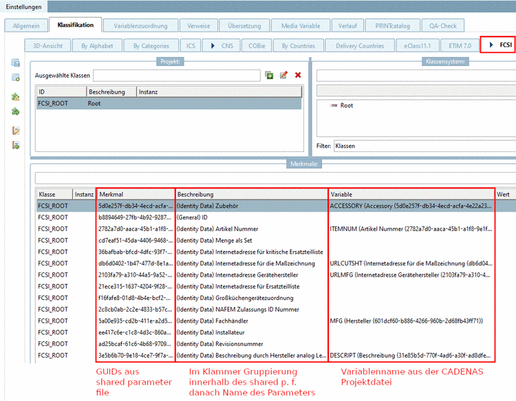 In this example the projects are classified with the FCSI classification. Respective CADENAS variables have been assigned to individual attributes (GUIDs from the Shared Parameter File).