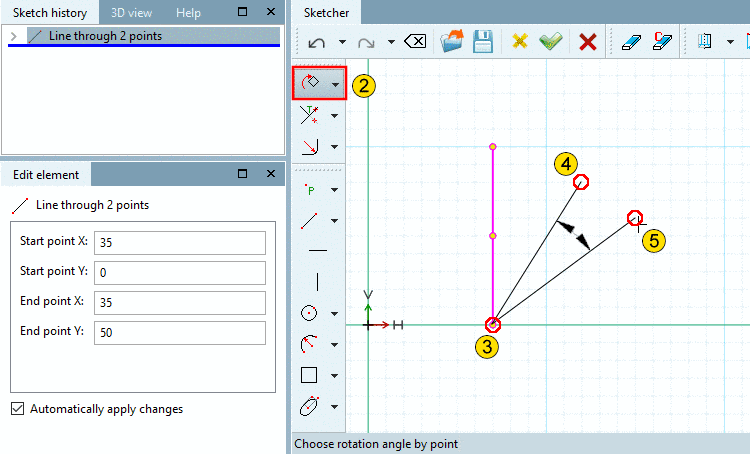 -> Once the second point is fixed the element is immediately rotated through the angle spanned by the two lines.