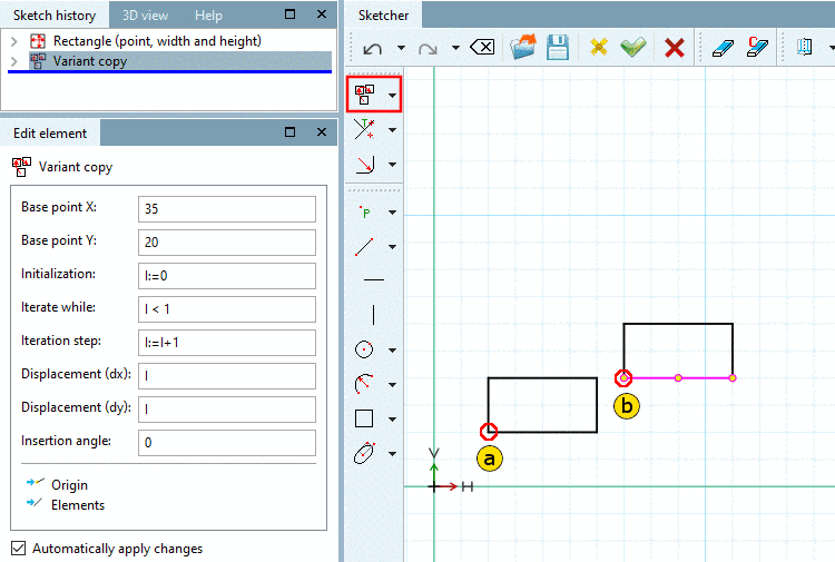 In below example five copies of the chosen element are created. The copies are shifted by 20 in the direction of x axis , 0 in the direction of y axis and rotated by 30° in each step of iteration.